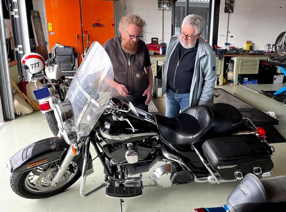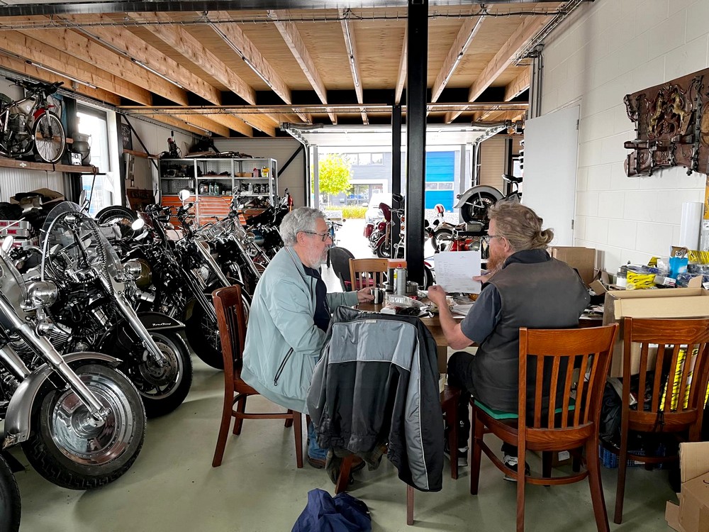 Waar koop je nog een Harley in zo'n entourage? Gezellig aan tafel bij