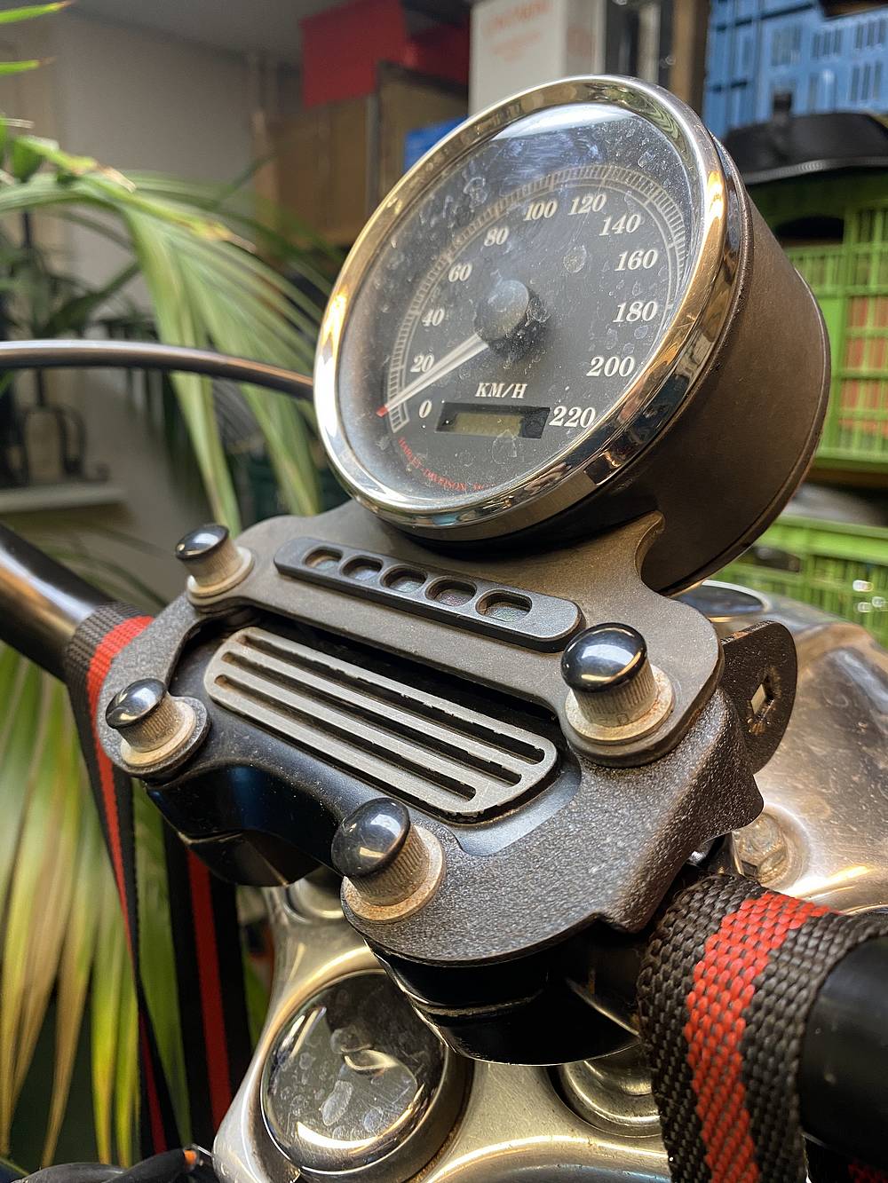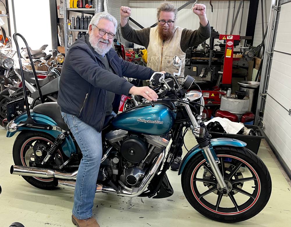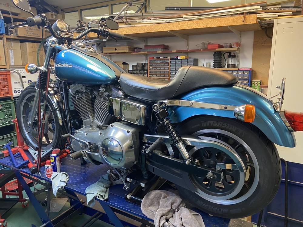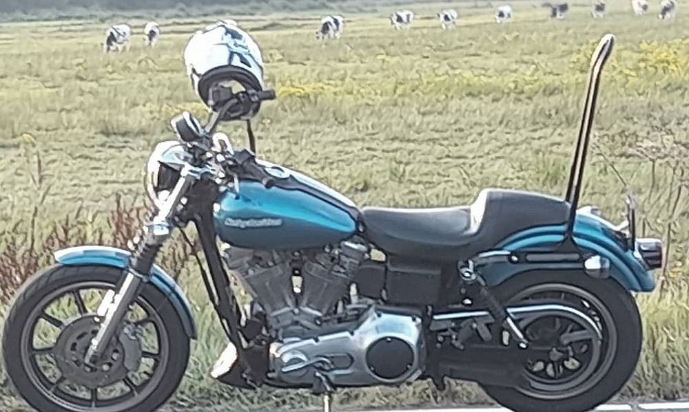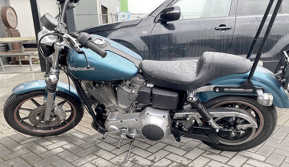 pretentieloze, niet opgedofte Harley. Hij stuurt redelijk, hij rijdt