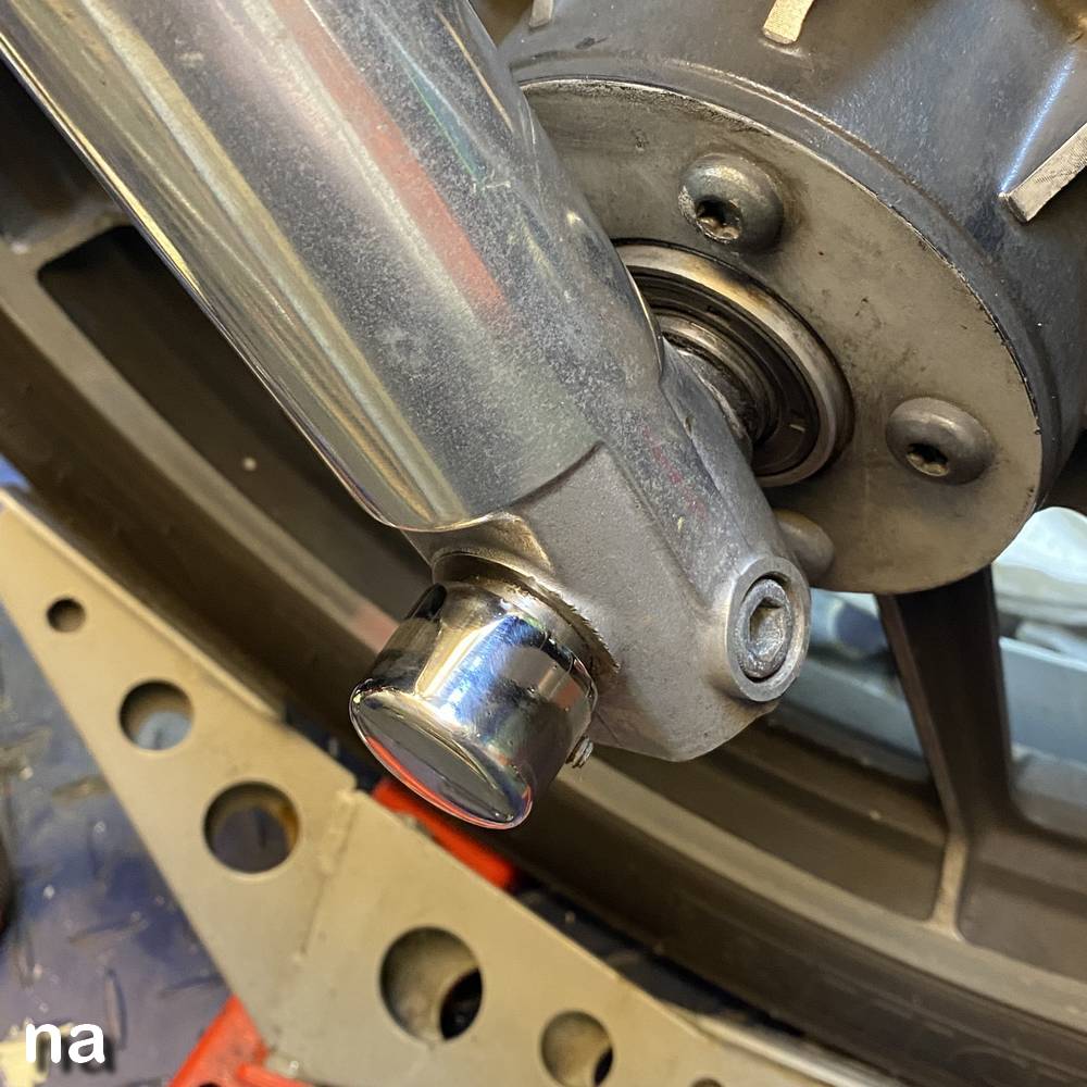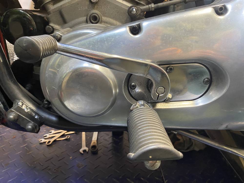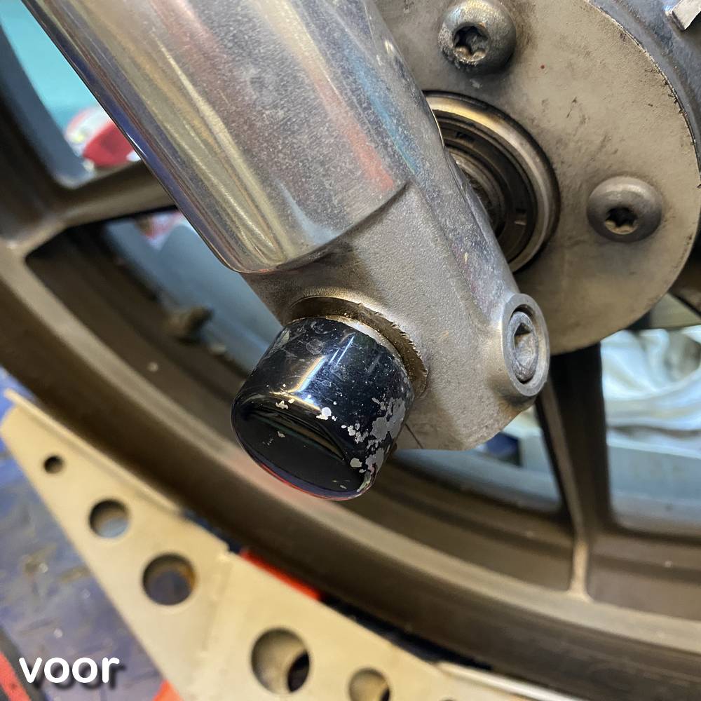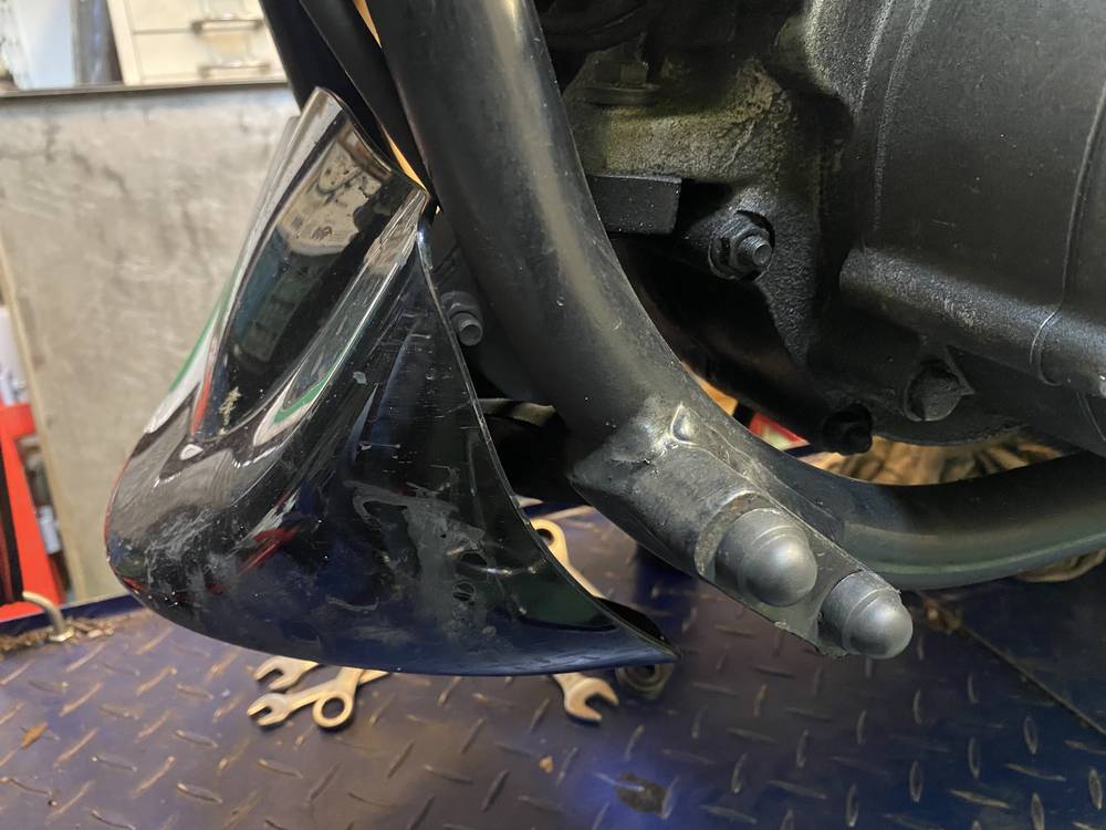 Hier heeft hij nog naar voren verplaatste footpegs. Zijn er al af. |
