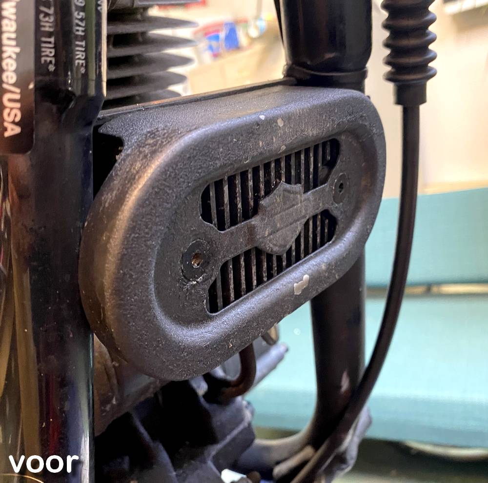 Ook dit stukje zwarte Harley kunst in wrinkle zwart wordt vervangen door