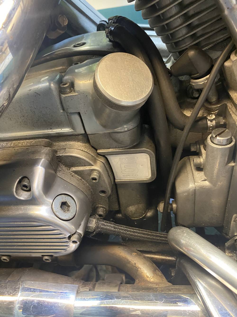 van het motorblok een kale aluminium afwerking in plaats van de zwarte