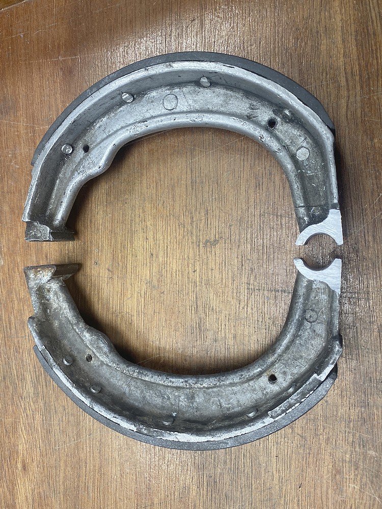 | 20-12-23: Vandaag mij eens gebogen over de achterrem. Normaal zitten er op een M72 remmen met 25mm brede remschoenen in de smalle trommel. In de jaren 80 kwamen er nieuwe wielen met bredere remtrommels. De zogenaamde bloemkool naven. Daarin zitten remschoenen van 30mm breed. Een aanzienlijke verbetering..... Althans voor die tijd. De vorige eigenaar heeft bloemkoolwielen op deze motor gebruikt. Daarin horen dus brede schoenen maar die passen niet op de remhevel. Hij heeft toen de remschoenen flink afgeslepen waardoor ze ongeveer 28mm breed waren geworden. Foto hieronder zie je het verschil tussen de afgeslepen schoenen en de 30mm. Hij heeft gelijmde schoenen gebruik omdat hij anders de klinknagels zou wegslijpen. | ||