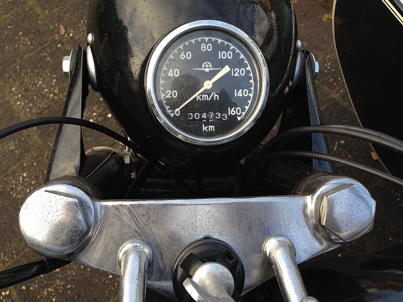 Ik ben de derde eigenaar. De kilometerstand? Tja kijk maar op de foto. Hij moet nog ingereden worden. Motorwerk verkoopt dit type naar wens. Zij noemen het de extended versie om onderscheid te maken tussen de originele 6 volt basic-uitvoering en dit model. De extra toevoegingen zijn: Laag voorspatbord, 12 volt installatie, Meer Chroom, Twee gereedschapskasten met in de rechter kist de electra, Geremd zijspanwiel, Betere lak met biezen. Oude model koplamp. | |