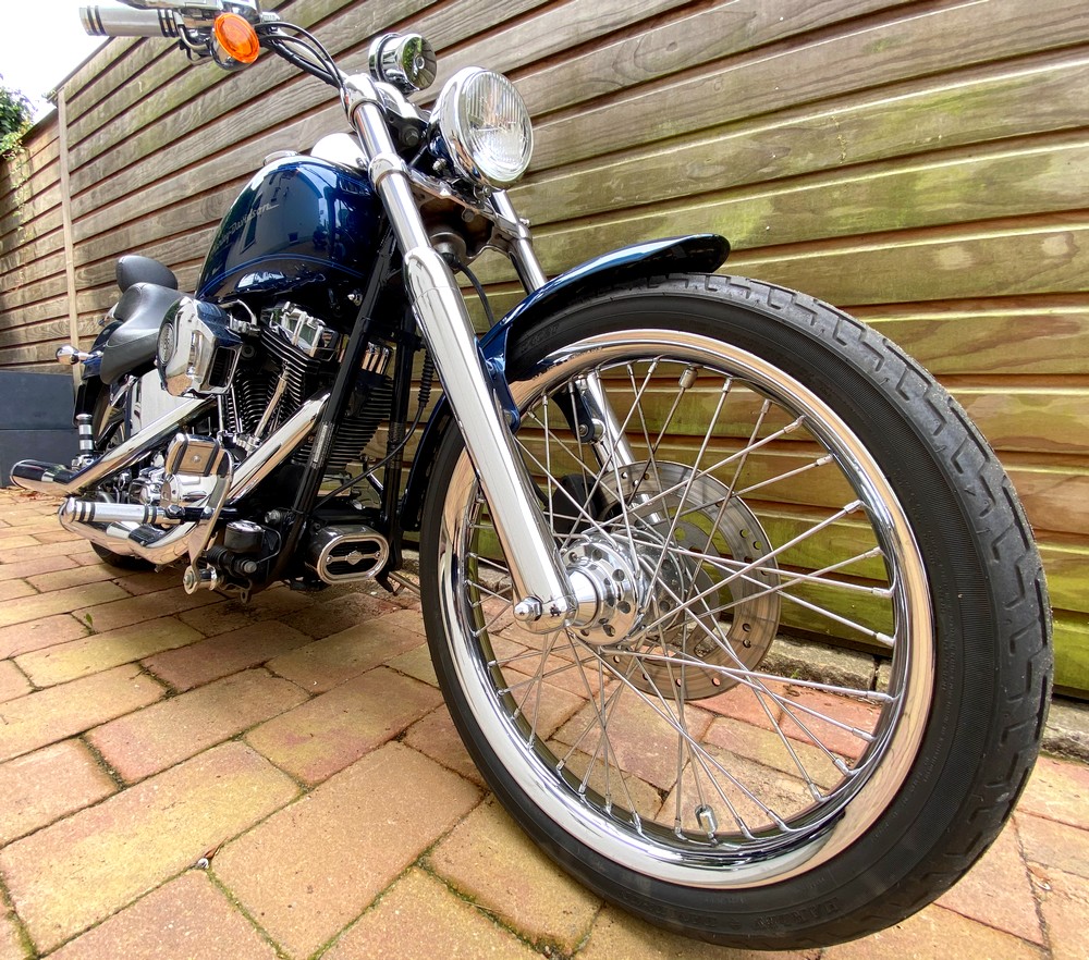 | 44608-08: het voorwiel is een iets afwijkend model dan standaard, dat maar een paar jaar op een Harley werd gebruikt. De velg is helemaal glad zonder de normale wat uitstekende of opstaande randen. Makkelijk poetsen en ziet er lekker strak uit. Niet iedereen was er blij mee. |