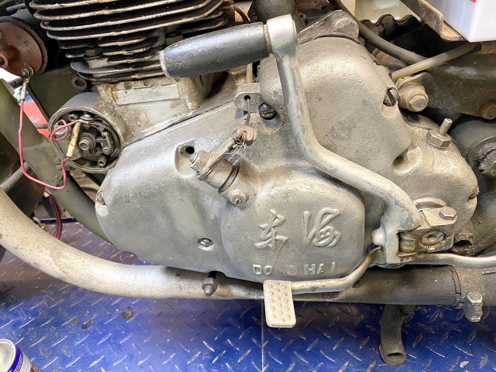 | Text on the left side. Probably means Don Hai but I couldn't find it. Visible is the clutch lever, kick starter and shift pedal. | ||