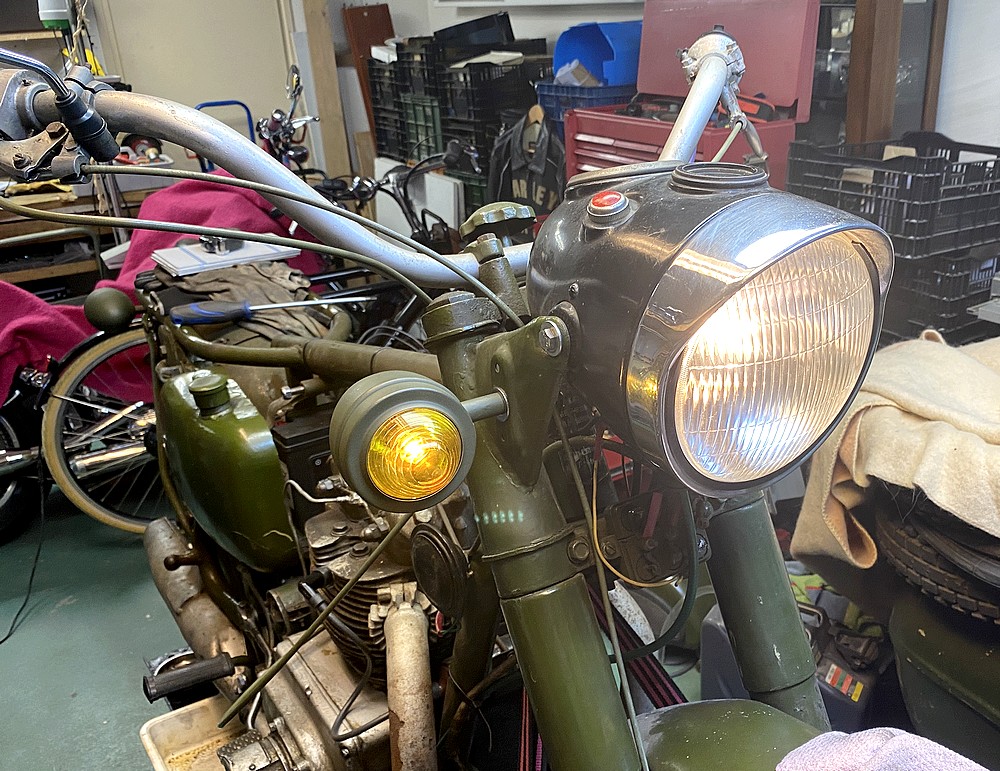 | 8-4-24: Today I celebrate the victory of my greatest enemy; the wiring of an old motorcycle. All lights and lamps work. Parking lights, low beam, high beam, brake lights and indicators. It was smart to replace the mirror in the headlight with a new one. The starter had also given up hope, but after a few good taps on the relay it got back to what it was made for. Next project: clutch lever. | ||