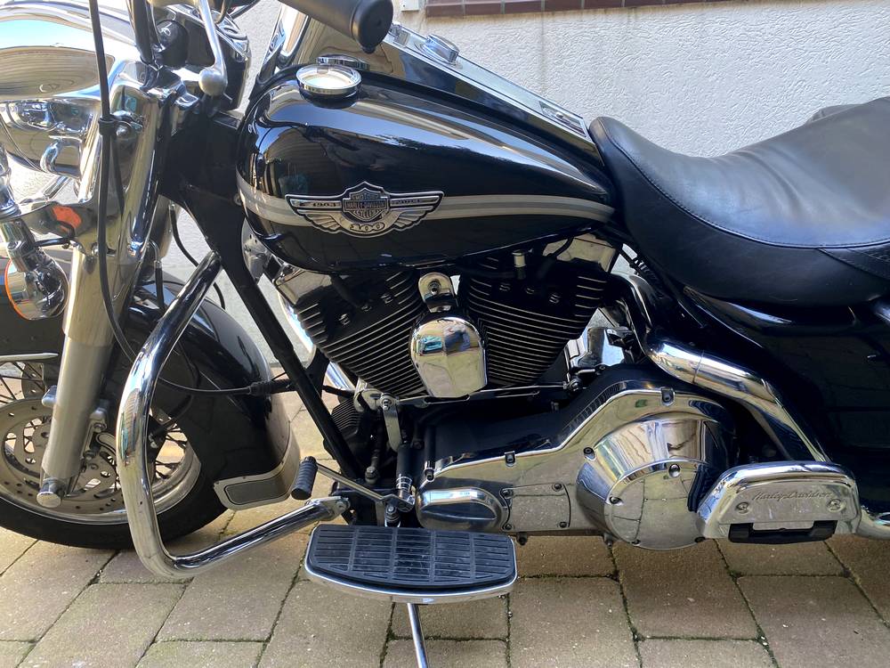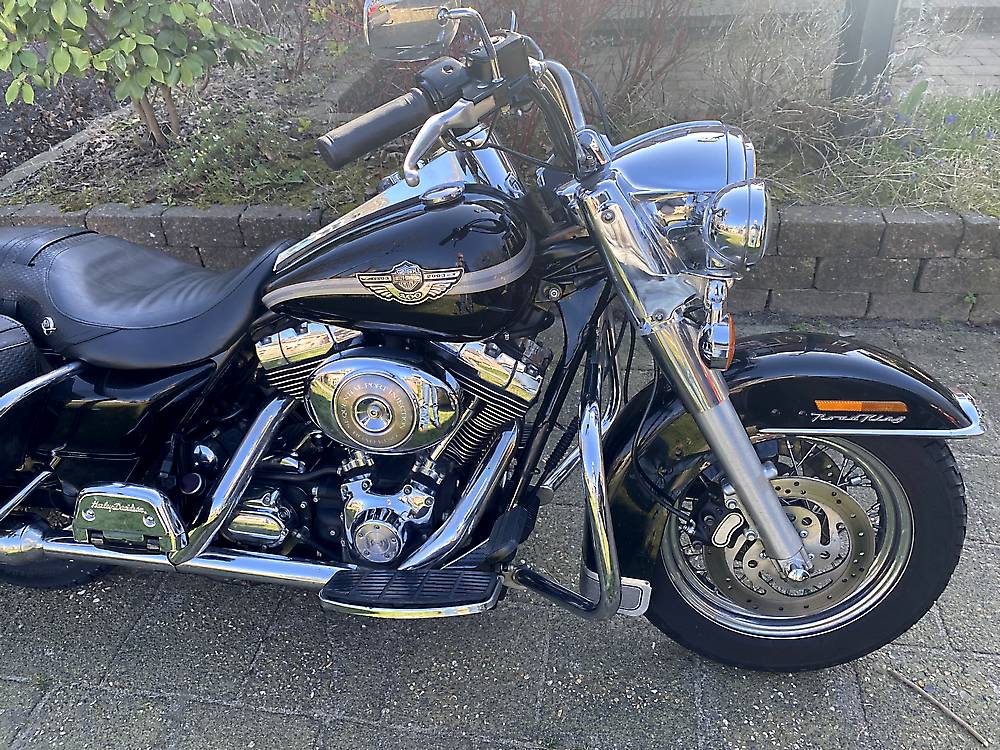 | De foto's zijn screenshots van een video die hij stuurde en dus naar Hasselt. Eén blik was genoeg om weer wat maanden iets te doen te hebben. Op dit moment is hij nog niet binnen, dat moet nog even geregeld worden. Ik vind dit model echt mooi. Het is een Road King Classic uit het jubeljaar 2003. De fabriek bestond toen 100 jaar. Ik heb er een gehad maar die was blauw. Die had meer dan 200.000 kilometer gelopen en deed het nog prima. Deze zwarte 160 duizend en dat bepaald meteen de prijs. Niemand koopt een Harley met die kilometerstand maar ik soms wel. We gaan het allemaal zien. Dit blok heeft zich allang bewezen en misschien is hij al eens gereviseerd, je weet het nooit. | |