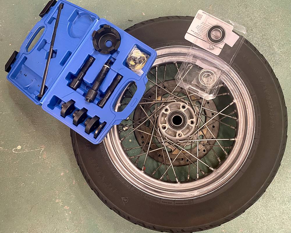 | Dat doppie was snel gekocht maar ik bedacht mij dat het misschien wel handig was om de wiellagers even te vernieuwen. Aan de aandrijfkant zat er een ietsiepietsie speling op. Ik had dat nog nooit gedaan dus eerst maar gekeken op Youtroep. Daar stonden best wel handige videootjes op en het was zo klaar. Makkie dacht ik. Enige wat je nodig hebt staat op de foto hier boven. Een speciaal setje en wat lagers. | |