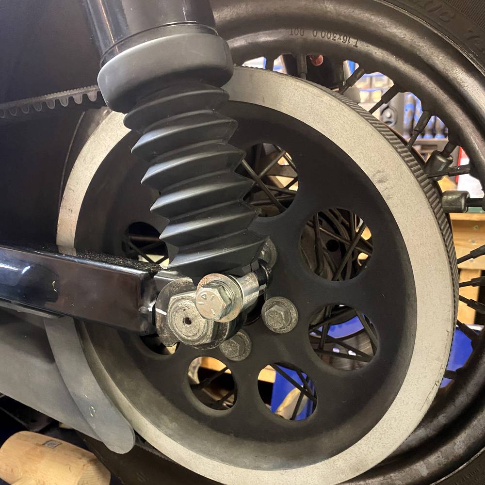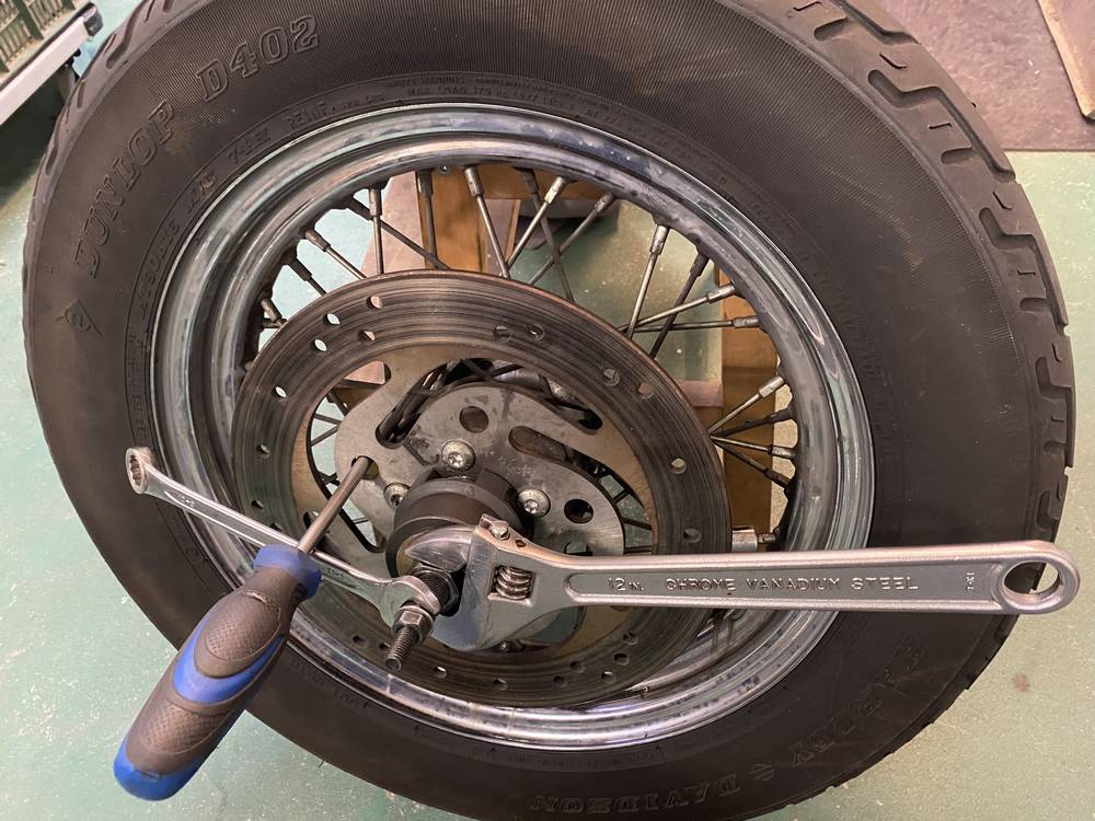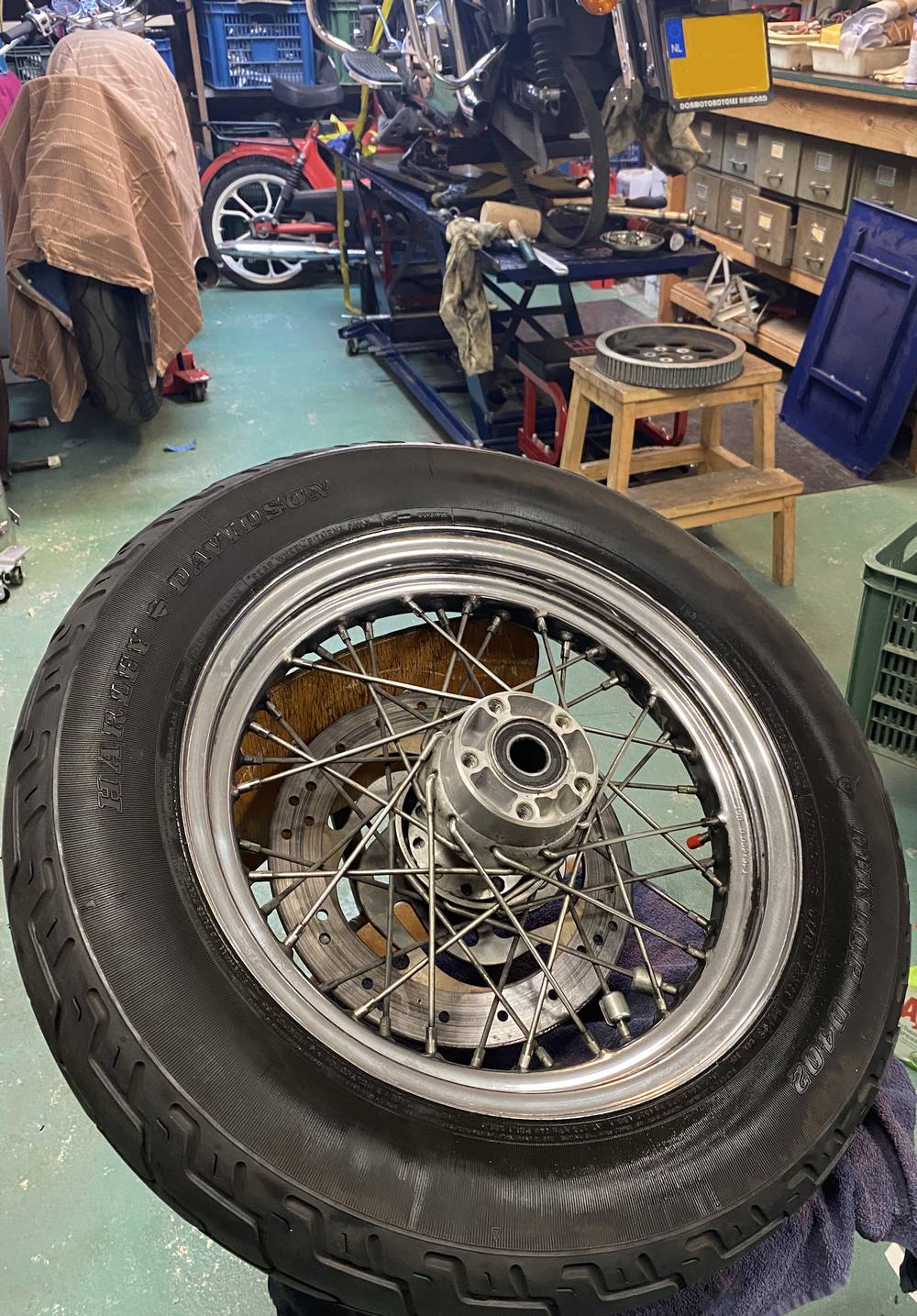 | De achterband ligt er om en het wiel zit weer in de brommert. Dat was nog een heel geklungel om alleen te doen. Vooral de spacers op de achteras was passen en meten. Maar met wat duwen en trekken zit alles weer op z'n plek. Ik kan dus wat afvinken van mijn to do list. Achterband, remblokken en riem opspannen. Alleen nog wat nieuwe remvloeistof als we toch bezig zijn. Daar heb ik wat voor bedacht dus ga ik dat uitproberen. De band is er door RBmotorhandel opgezet met een nieuwe binnenband en ik heb hem zelf uitgebalanceerd. | |
