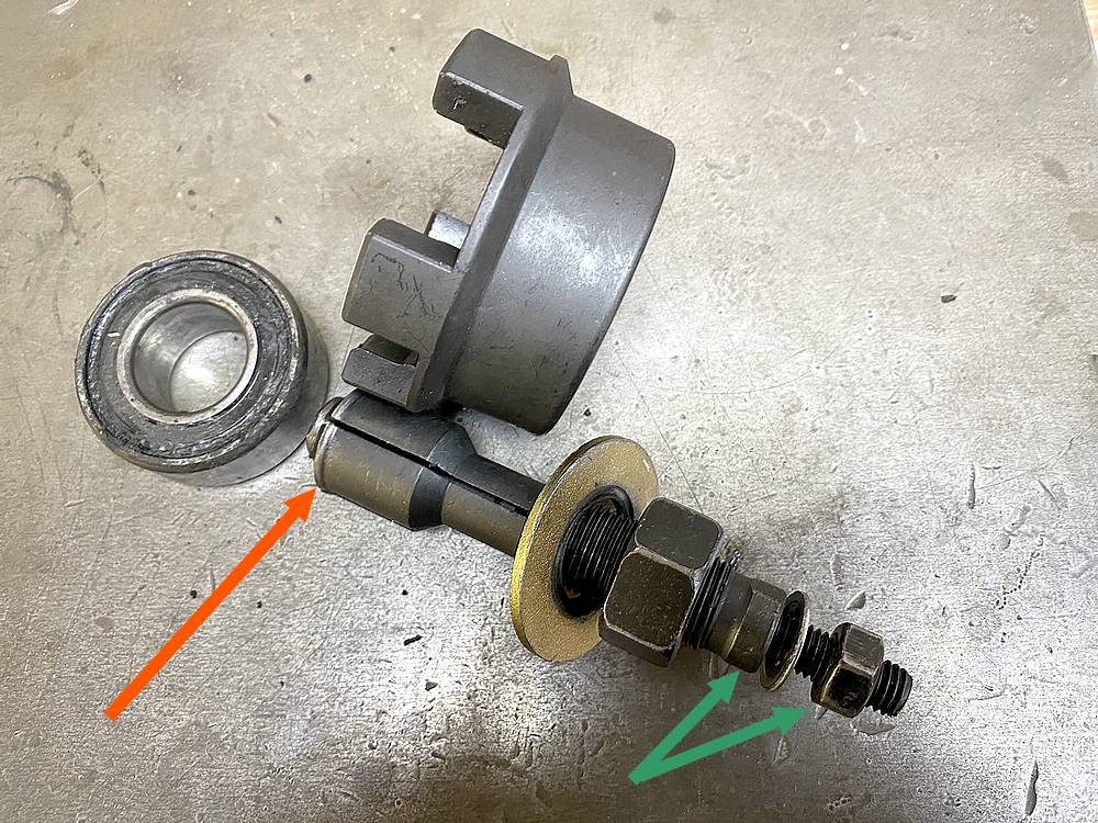 | Wat heb ik geleerd? Dat randje die de rode pijl aanwijst moet echt achter het lager terechtkomen. Dat gaat op gevoel. De as en de moer bij de groene pijlen zorgen er voor dat dit achter het lager blijft zitten waarmee je dat er dus uittrekt. Daar ging het steeds mis. Je moet beiden enorm strak aandraaien totdat het lijkt alsof je het schroefdraad vernield. Dan dus de naaf flink heet stoken met de stripper. Alles nog wat aandraaien en toen lukte het eigenlijk vrij gemakkelijk. Het lastige is dat je twee dingen moet vasthouden. Ik loste dat op zoals op drie foto's hierboven. | |