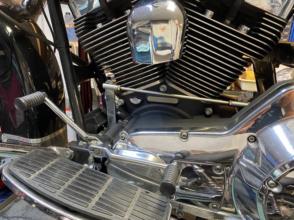 | Elke Harley wordt meestal voorzien van persoonlijke voorkeuren en glimmende spulletjes zonder het origineel teveel te veranderen. Je ziet weinig compleet originele exemplaren. Dat is bij mij ook zo. Zo vind ik die hak-teen schakelpedalen verschrikkelijk dus die moest er af. In de plaats de "hak" pedaal kwam een chromen busje die natuurlijk weer 5 mm te breed was. Dat krijg je met die troep van Ali. Maar zo heb ik wat meer ruimte om mijn voeten anders te zetten tijdens het rijden. Ook de schakelstang heb ik vervangen door een mooiere en steviger exemplaar. De kogelgewrichten zijn veel groter en steviger. Het verschil is te zien op de foto's hier onder. | |